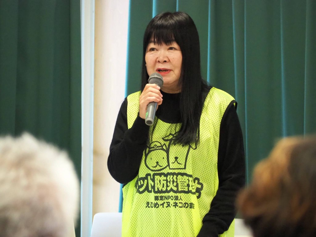 10分間の休憩のあとは、全国各地からお招きした2組のゲストが登場しました。1組目は「えひめイヌ・ネコの会」のみなさん。20年前より松山市の防災訓練においてペットの避難所を開設運営し、2016年からは「ペット防災管理士育成講座」を開催してきた、ペット防災の先駆け的な存在です。