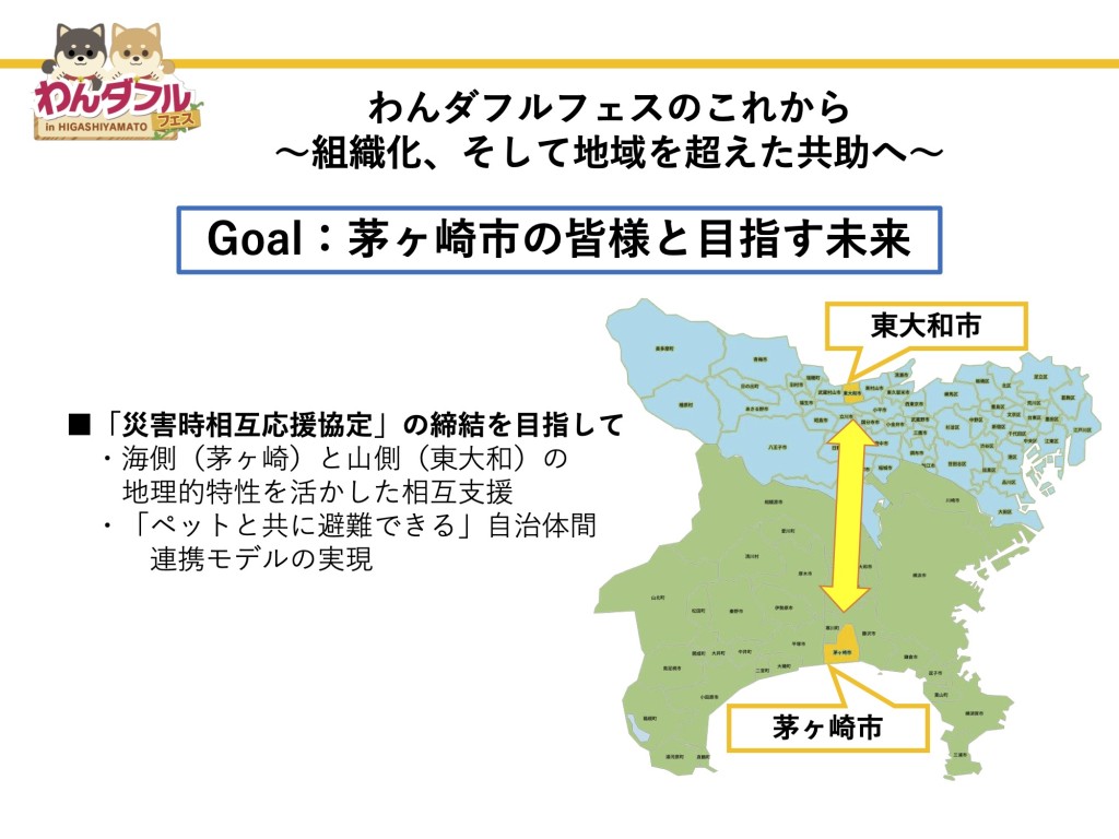「東大和と茅ヶ崎、海と山で環境はかなり違います。距離は離れていますが、車で1時間半で行き来できる距離ですので、海と山の地域特性を生かした相互支援を行い、ペットと共に避難できる自治体関連系モデルを実現していきたい」