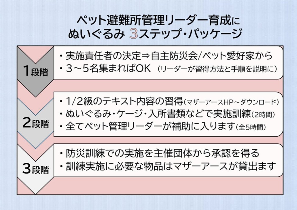 さらに自主防災組織やペット愛好家など誰でもペット避難管理リーダー育成に携わることができるよう、「3ステップパッケージ」を用意。育成テキストは誰でも無料でダウンロードできるようにホームページに掲載しているほか、訓練実施に必要な物品の貸し出しも行っています。
